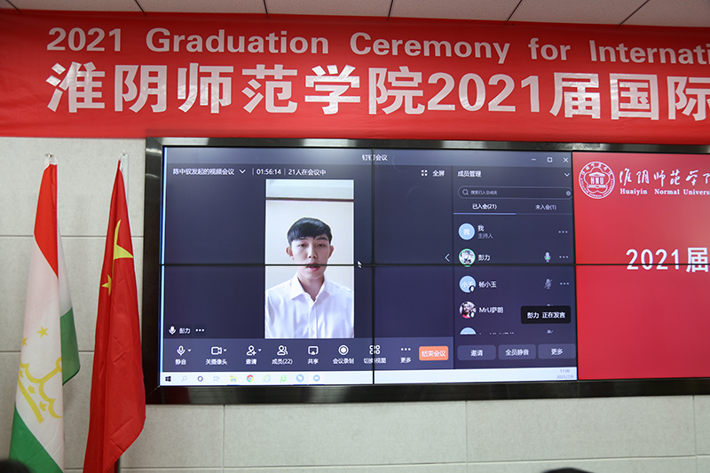 经管学院彭力同学和计科学院远秀玲同学作为国际学生代表在线上发言,他们回忆了四年来在淮师学习生活的点点滴滴,这段经历让他们收获良多,并向老师和同学们表达了诚挚的谢意。中国是他们的第二个家,在今后的学习工作中,他们会谨记老师们的教导,努力成长为让母校骄傲的国际学生。