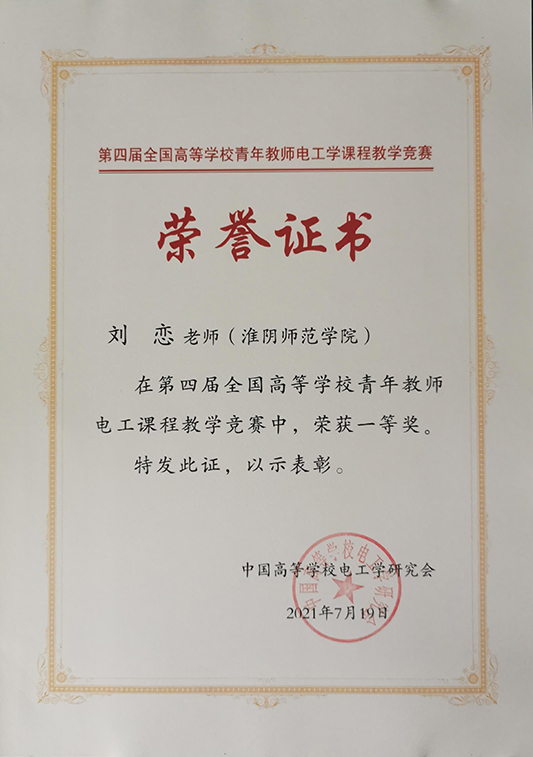 图为淮师刘恋老师荣获全国高校青年教师电工学课程教学竞赛一等奖