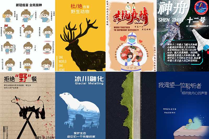 比赛共分为科普影视、平面设计、科学摄影、文化创意四个版块内容,以多种艺术形式凝聚社会共识,推动科学普及。在平面设计类作品中,19级数媒专业王楠的作品《新冠疫苗 全民接种表情包》荣获一等奖,19级数媒专业孟奕彤的作品《One world one home》、20级广播电视编导专业陈丽羽的作品《白衫挥挥护家园》荣获二等奖,19级数媒专业杨雨晴的作品《拒绝“野”餐》、19级数媒专业胡可的作品《保护生态,和谐共处》、19级数媒专业陈晶晶的作品《我渴望》、19级数媒专业吴姜的作品《神舟十二号》荣获三等奖;在科学摄影类作品中,19级数媒专业陈稳的作品《动物“仿生学”》荣获一等奖,19级广播电视编导专业田苏、殷德鹏的作品《自然界的“传播者”》荣获二等奖。