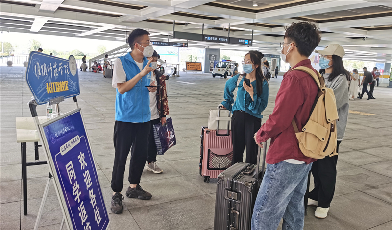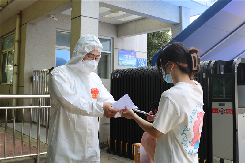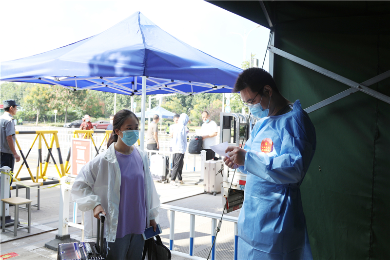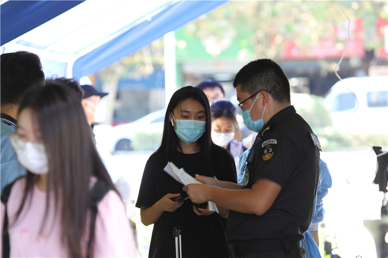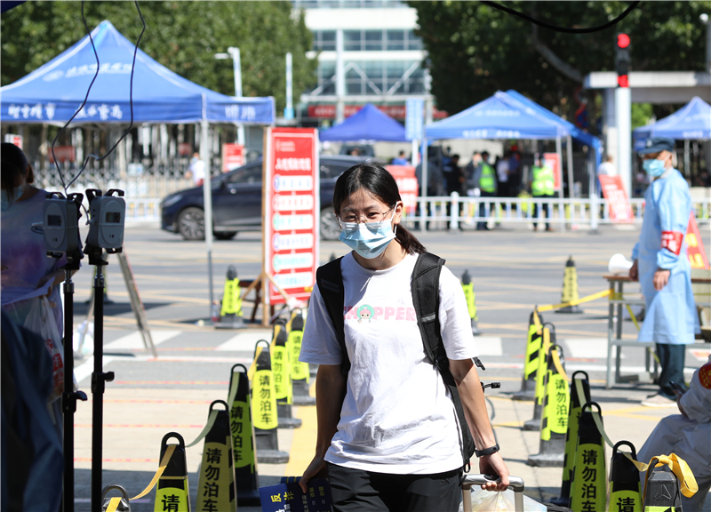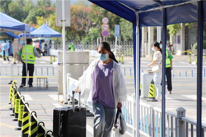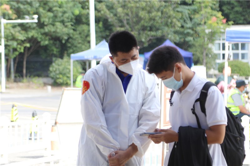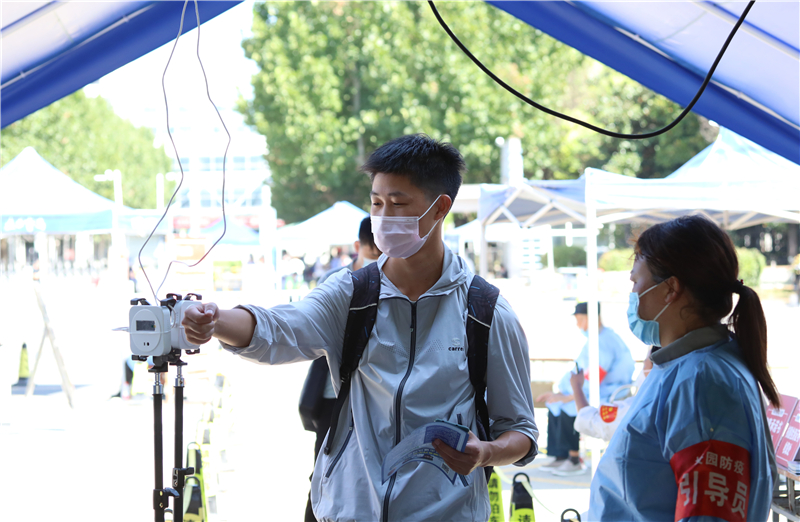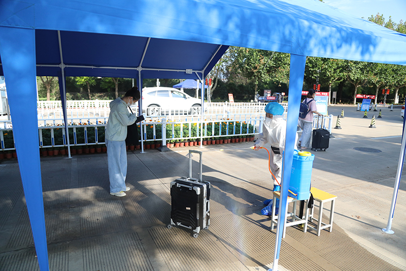 返校报到处,返校学生均按要求佩戴口罩,在学校工作人员和教师志愿者的引导下,保持1米以上安全间隔有序排队,依次有序进行体温测量、核酸检测证明查验、健康码和行程码查验、报到信息核验、消毒、提交健康承诺书等流程,审核通过后进入校园。
