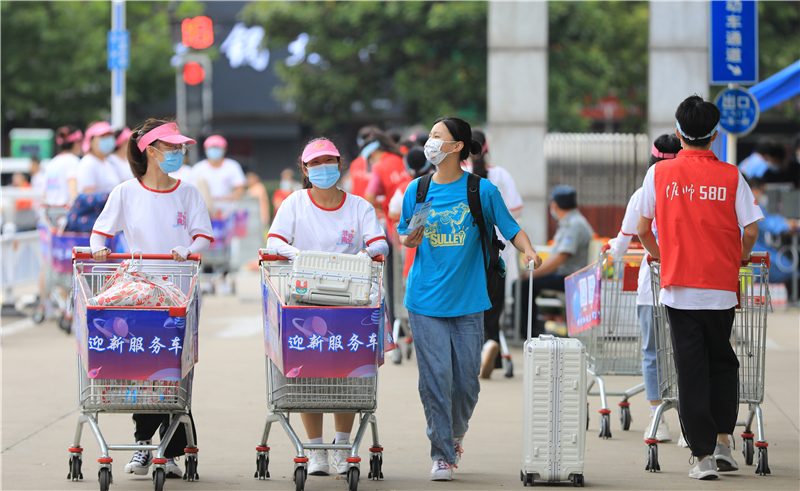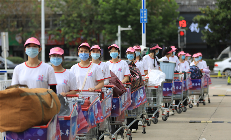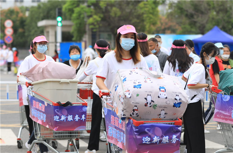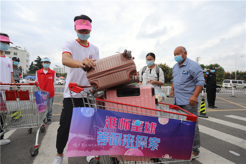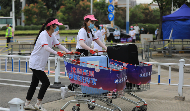 校团委招募了近500名志愿者,他们统一着装,以热情、阳光的青春风貌,负责接站、校内引导、行李运送等服务工作,通过“无缝衔接”式的志愿服务帮助新生顺利到达“淮师星球”,确保新生从走出车站到进入校园,处处都能感受到格外的热情和温暖。校外接站志愿者凌晨五点多就出发前往机场、高铁站、火车站、汽车站等6个接站点做好迎接新生的准备,新生到站由志愿者引导统一乘坐大巴至学校门口,接驳车上播放专题宣传片介绍学校情况。校内迎新志愿者整齐列队,主动迎接新同学,实行“一对一”“多对一”志愿服务,用“迎新服务车”帮助同学们运送行李,将同学们分散、分批接送入校至各学院迎新点,再由各学院通过“爱心接驳车队”,直接送达各学院宿舍,这也是各学生组织用实际行动诠释着“我为同学做件事”。