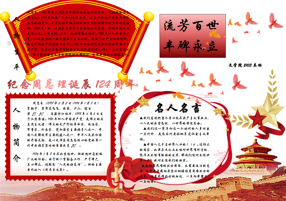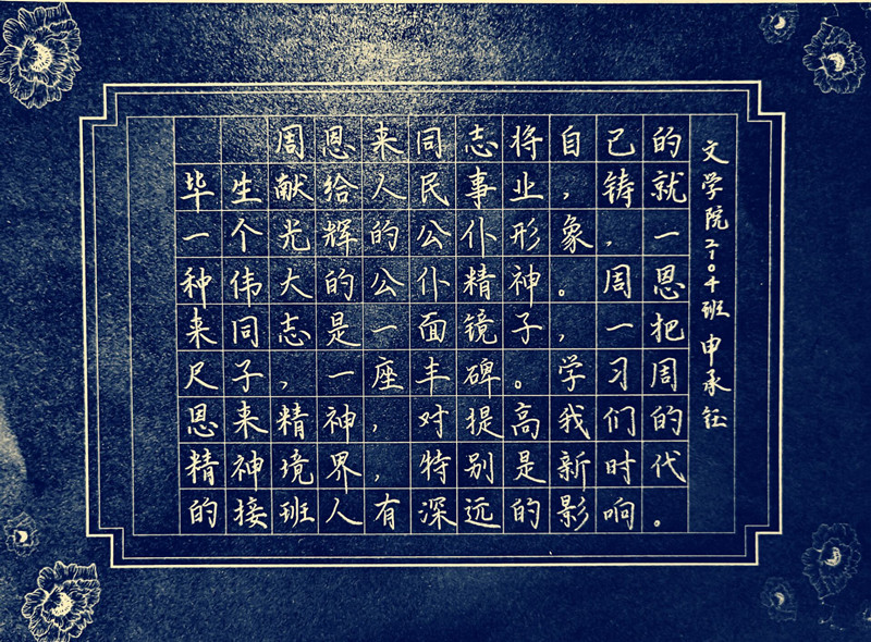 “周恩来总理的信仰选择和确立对青年大学生有什么样启示”“周恩来精神与伟大建党精神又有怎样的联系”,马克思主义学院、历史学院、化学化工学院学子围绕主题,通过举办线上线下主题班会、团日活动等方式,深入研读“习近平总书记在纪念周恩来同志诞辰120周年座谈会上讲话”原文,深刻领悟杰出楷模周恩来的崇高精神内涵和时代价值。文学院学子举办“缅怀过往 追思朝阳”主题活动,同学们通过观看《少年周恩来》的影片,为影片《法兰西岁月》配音,表达了对周总理的深深缅怀。经管学院、生科院学子以微信、微博等新媒体平台为阵地,推送发布纪念周恩来总理诞辰原创文案,讲述周总理直击人心的生平故事,激发更多学子参与互动交流。法政学院、数统学院、体育学院学子通过开展“读周恩来原著,写心得体会”征文分享活动、恩来故事分享活动等,以笔述情思、以声寄恩来,在情理交融中感悟伟人的精神风范。广大学子还通过“三行情诗”、书法创造、剪纸绘画、海报设计等艺术创作,表达了自己对周恩来总理的缅怀以及周恩来精神内涵的领悟。