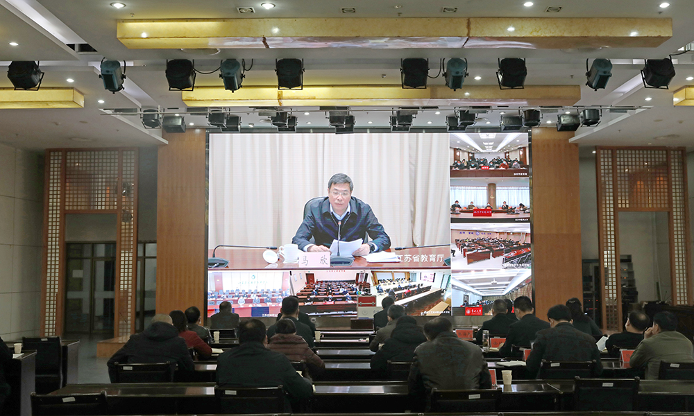 图为淮师参加全省教育系统疫情防控视频调度会。记者 唐瑀 摄
