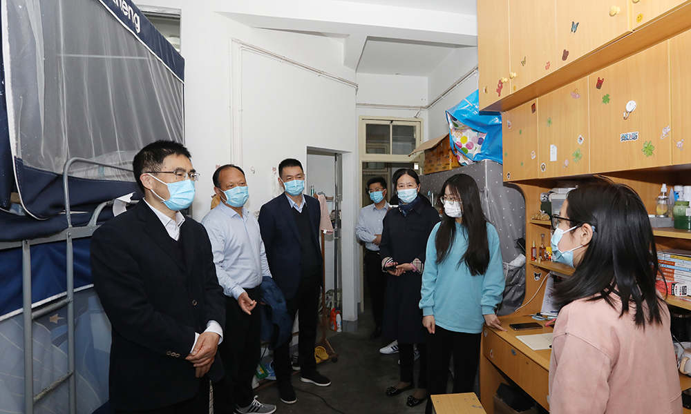 “家是哪里的呀?”“食堂饭菜怎么样?”“要主动多给家人打电话啊……”看似寻常简单的交谈,传递着真切的关心。在走访过程中,焦富民亲切询问了同学们的家乡情况、学习情况、生活情况,还就宿舍管理、食堂餐饮、学习就业等方面征求了同学们的建议意见。焦富民感谢同学们为守护校园安全做出支持与努力,同时叮嘱同学们继续严格遵守学校疫情防控相关管理规定,做好个人防护;在有需要和困难的时候,积极与辅导员、班主任以及任课老师沟通交流;注意劳逸结合,坚持每天活动一小时,形成良好的生活习惯和积极的心理状态,真正做到全校师生勠力同心,为打赢疫情防控校园保卫战贡献出自己的力量。