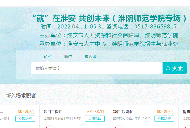 图为淮师与淮安市人力资源和社会保障局联合举办网络招聘会。