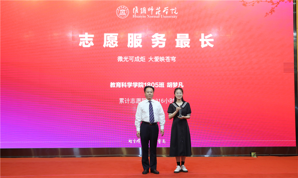 图为杨亚军为志愿服务时长最长毕业生颁奖。记者 唐瑀 摄