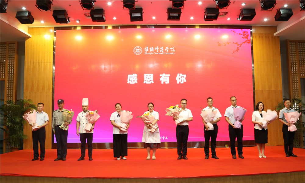 图为毕业生代表为“我最喜爱的老师”、宿管员等教职员工及家长代表献花。记者 唐瑀 摄