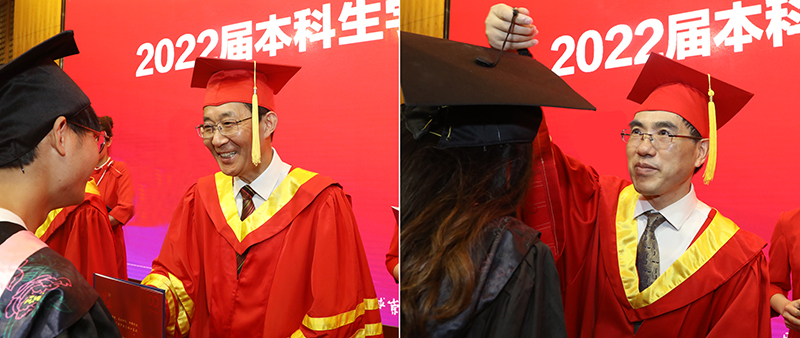图为校党委书记朱汉清、校长焦富民为毕业生拨穗。记者 唐瑀 摄