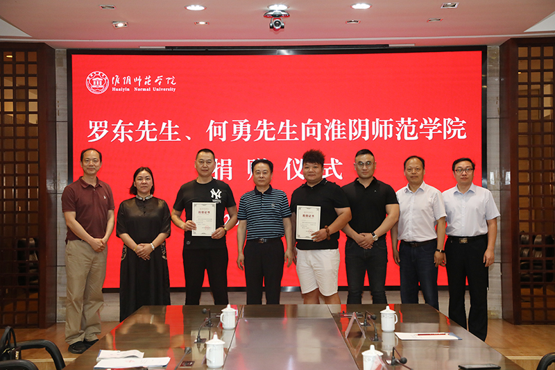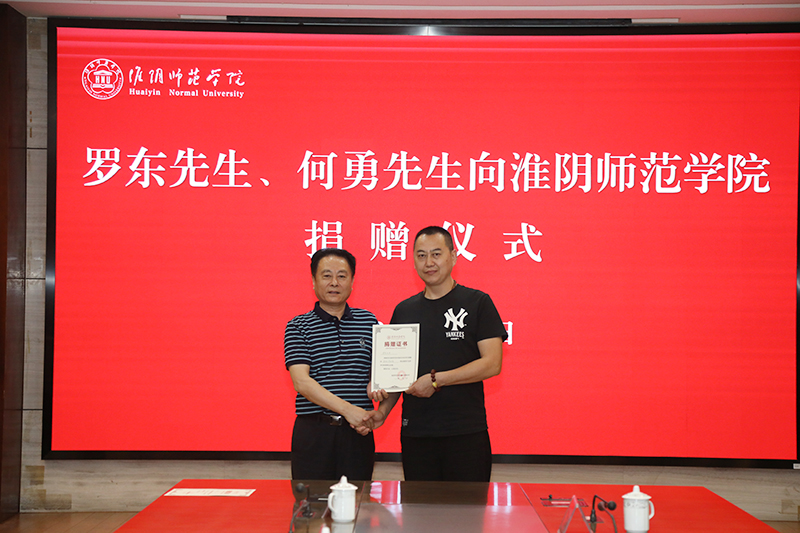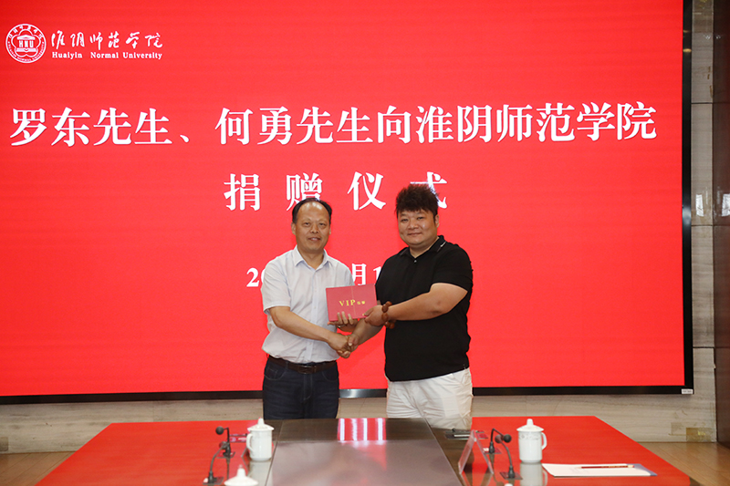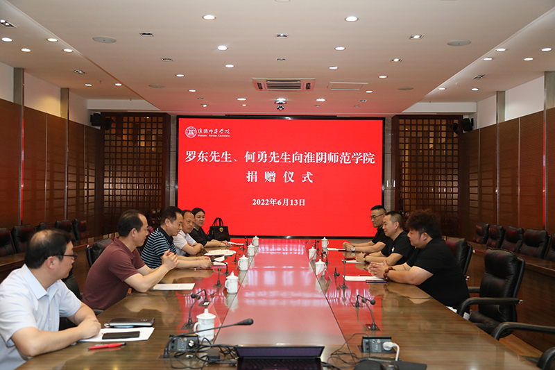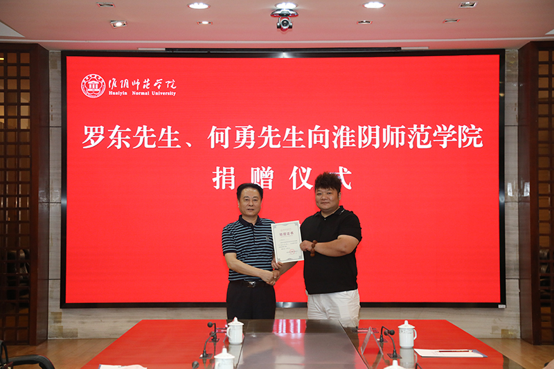 淮师新闻网6月15日电(记者 周鹏)6月13日下午,必赢nn699举行社会人士捐赠仪式。中国民主同盟盟员、国家一级美术师罗东先生,德润羊餐饮管理有限公司投资人何勇先生,校党委副书记、副校长杨亚军出席捐赠仪式。