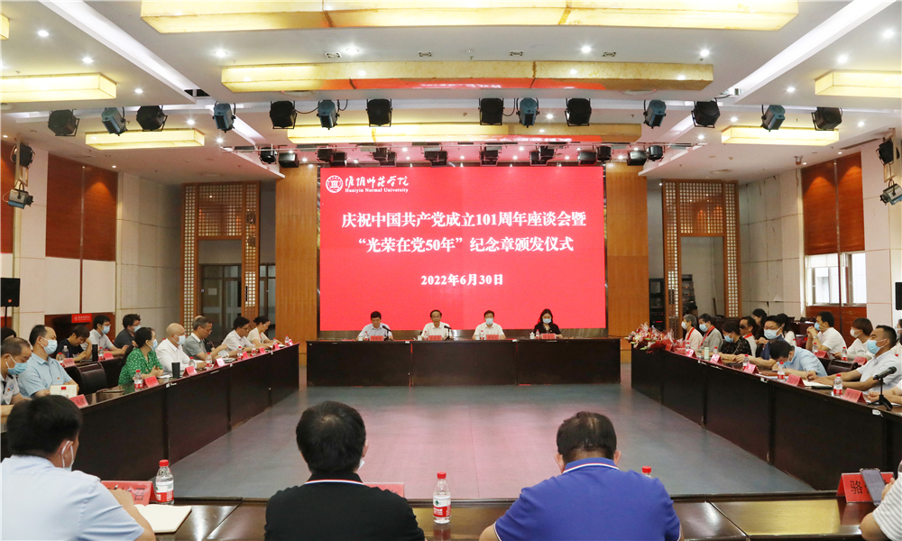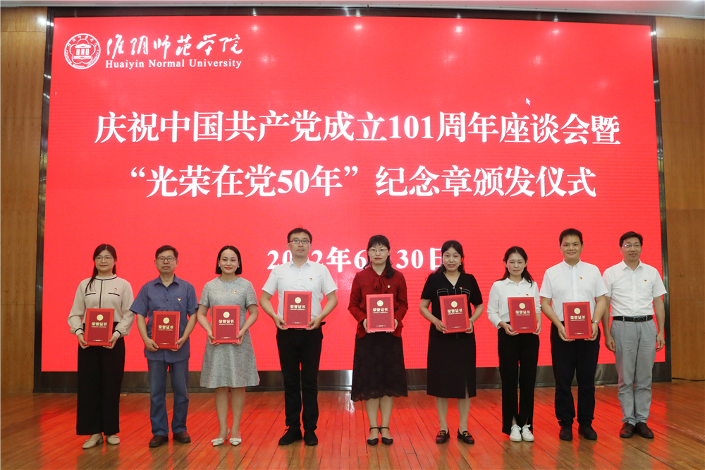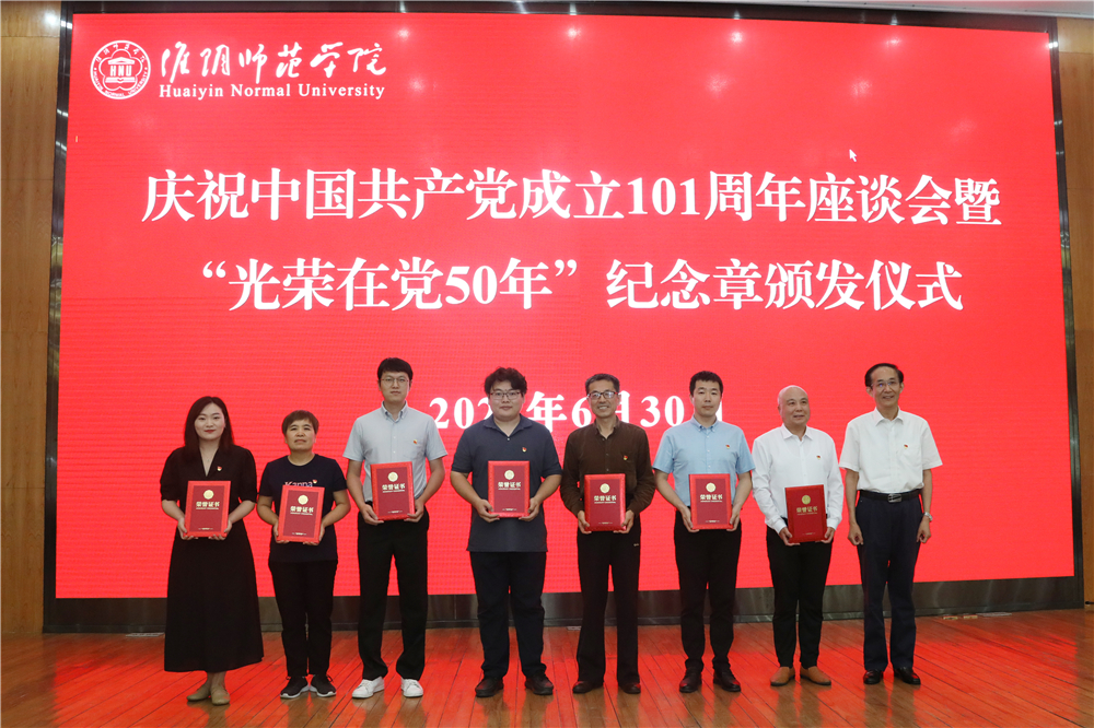 图为淮师举行庆祝中国共产党成立101周年座谈会暨“光荣在党50年”纪念章颁发仪式。记者 唐瑀 摄