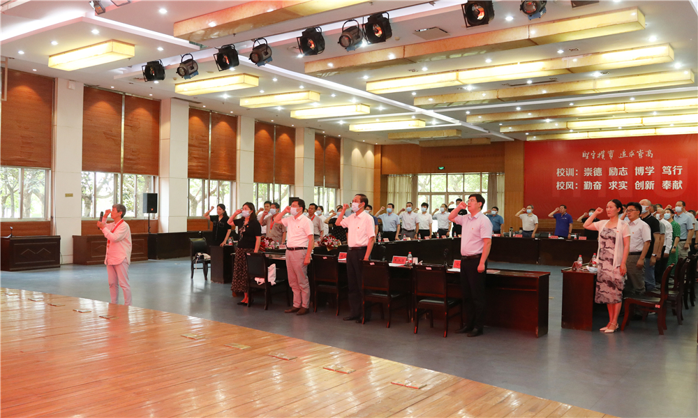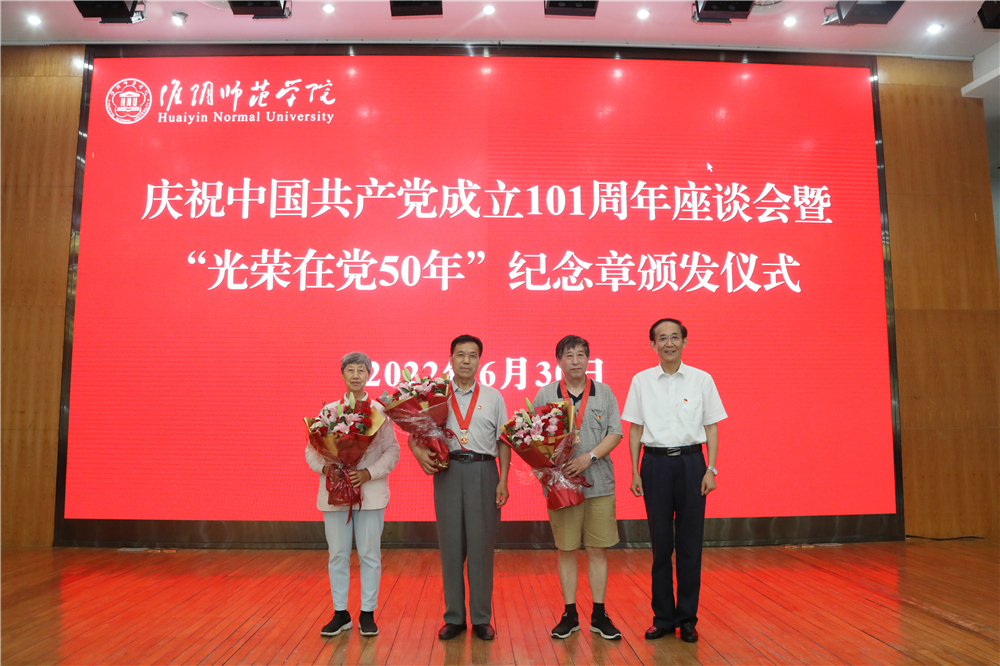 朱汉清代表校党委向获得“光荣在党50年”纪念章的老党员表示热烈祝贺,并向全校各级党组织和全体师生党员送上节日祝福。他说,在党的二十大召开之年,中国共产党成立101周年前夕,我们以召开座谈会、颁发“光荣在党50年”纪念章、重温入党誓词的方式,共同庆祝党的生日,共同回顾党的光辉历程、缅怀先烈的丰功伟绩,共同思考与展望淮师发展的新征程,具有重要意义。