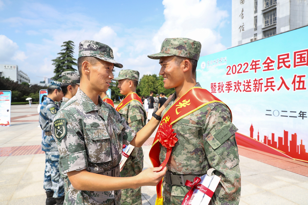 图为尚洪波为新生佩戴“光荣入伍”绶带。记者 张菁菁 摄