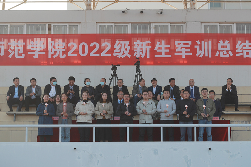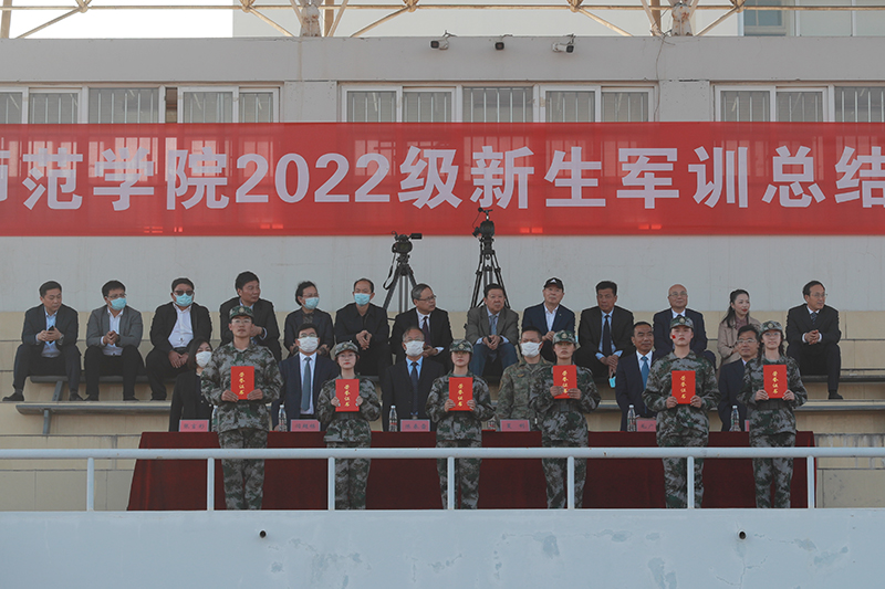 大会对军训汇演一、二、三等奖,对军训中表现突出的军事训练标兵、军训内务标兵和军训工作先进个人进行了表彰,主席台前排就座的领导为获奖代表颁奖。