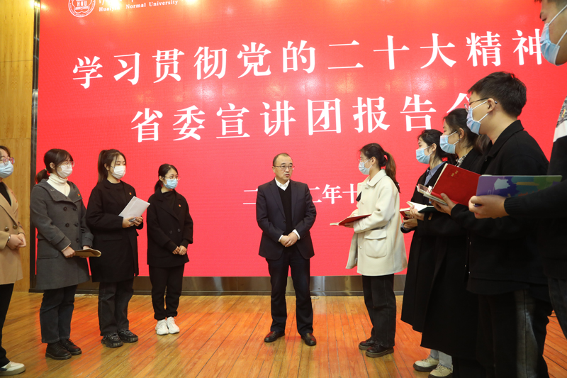 尚洪波在主持报告会时指出,王建华教授的宣讲报告,主题鲜明、脉络清晰、内涵丰富,既有政治高度,又有理论深度,对于我们全面学习领会党的二十大精神,进一步统一思想、凝聚共识,深入思考和推动党的二十大精神在淮师落地生根,具有很强的指导性和针对性。
