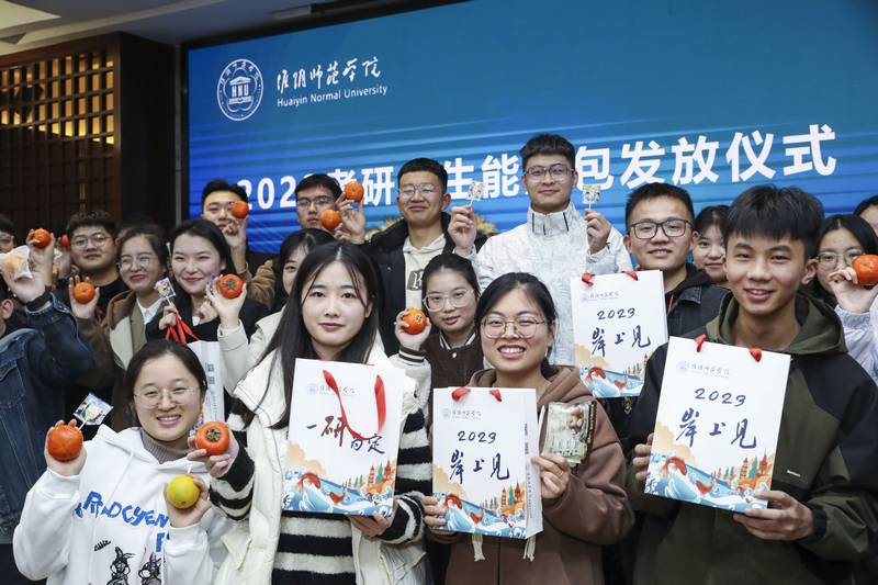 图为校领导为考研学生代表发放“考研冲刺能量包”。记者 张菁菁 摄