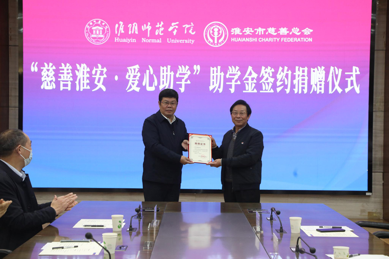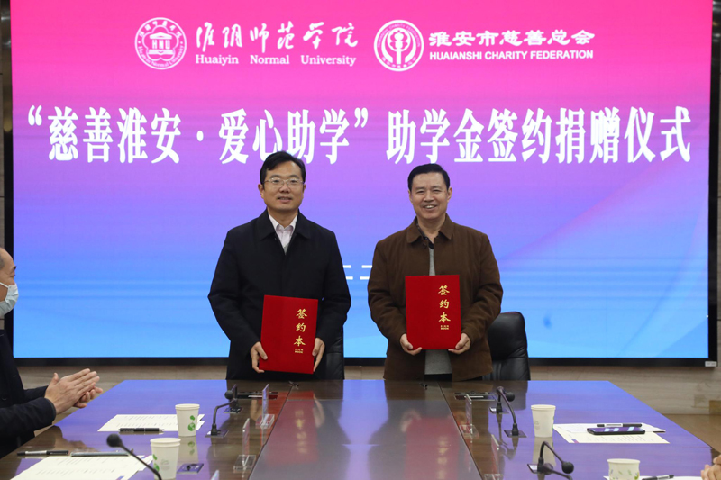 胡元林和李玉国代表双方签订了2022年度资助协议;陈洪玉代表慈善总会向校方捐赠“慈善淮安 爱心助学”助学金;赵宜江代表学校向慈善总会颁发捐赠证书。