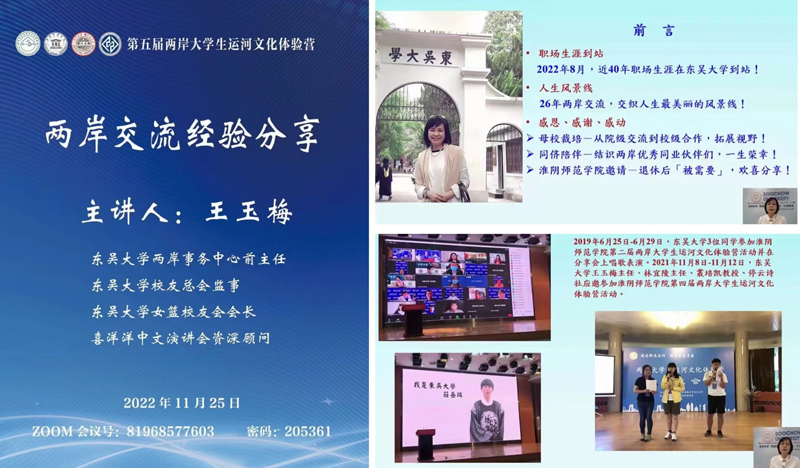 台中科技大学语文学院院长李右芷教授、副院长廖藤叶教授、应用中文系何宝篮主任、原主任张致苾,以及海峡两岸部分高校的师生代表为此次活动送来了视频寄语。东吴大学两岸事务中心前主任、东吴大学校友总会监事王玉梅女士饱含深情,为线上师生分享了自己在两岸高校交流工作的宝贵经验与深切感悟。