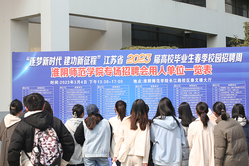 淮师新闻网3月4日电(记者 张菁菁 杨金菊 彭若男 李金雨)3月4日,“逐梦新时代 建功新征程”江苏省2023届高校毕业生春季校园招聘周必赢nn699专场招聘活动在长江路校区崇文楼大厅举行。校党委书记尚洪波、副校长闫超栋,相关职能部门负责人,各二级学院党政负责人、辅导员,220余家企业及近4000余名毕业生参加活动。
