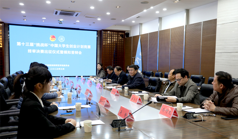 淮师新闻网3月16日电(记者 夏振华)3月15日上午,第十三届“挑战杯”中国大学生创业计划竞赛终审决赛出征仪式暨模拟答辩会在图书馆第一会议室举行。校长赵宜江出席活动并讲话。党办、校办、教务部、财务处、团委、物电学院等单位负责人以及参赛团队师生代表参加了出征仪式。