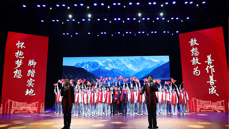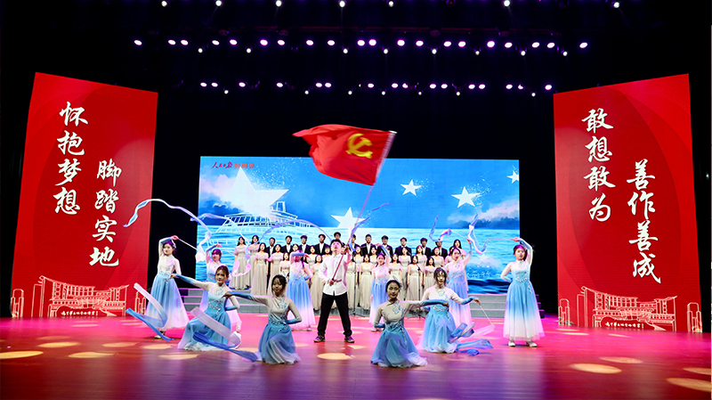 “伟大的中国共产党,风华正茂、山高水长,昂首挺立在新时代的征程上;伟大的中国共产党,乘风破浪、扬帆远航,领航中国在新时代的征程上……”音乐学院合唱团带领全场观众齐唱《领航》,如旗帜,似号角,激励着淮师青年追随在中国共产党的旗帜下奋勇前进。