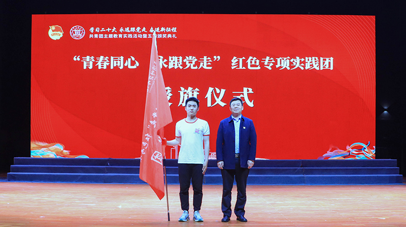 与会领导为2022年度获得表彰的共青团组织和个人代表颁奖,并为“青春同心 永跟党走”红色专项实践团授旗。
