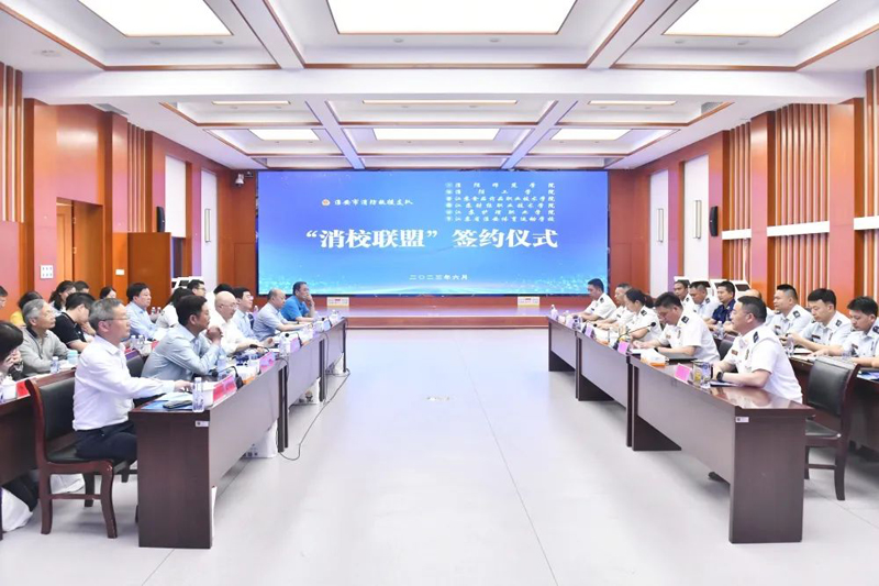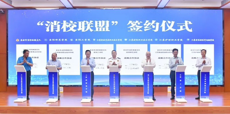 在淮大中专院校领导与淮安市消防救援支队签订战略合作协议,就加强组织领导、做好消防工作、提供智力支撑、开展共建活动等方面达成共识。