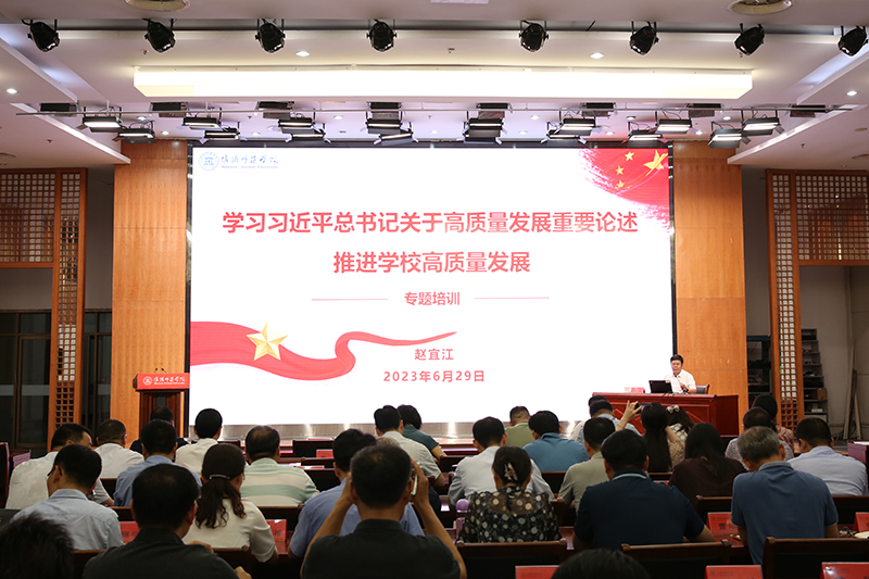 赵宜江以《学习习近平总书记关于高质量发展重要论述推进学校高质量发展》为题,从“高质量发展的主要内容”“高质量发展的研读思悟”“高等教育高质量发展的主要内容”“高等教育高质量发展的实践思考”等四个方面为大家解读了习近平总书记关于高质量发展的重要论述。