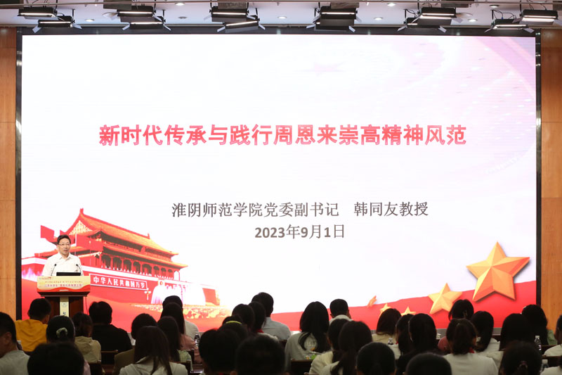 主题报告环节围绕“弘扬新旅光荣传统 争做‘四个自信’少年”“新时代传承和践行周恩来崇高精神风范”“新四军刘老庄连精神及其时代价值”等三个主题开展。新安旅行团历史纪念馆解满娟介绍了新安旅行团的光荣传统,阐释了新旅爱党爱国、顽强拼搏、刻苦学习、自主自立的丰富精神内涵。必赢nn699党委副书记韩同友从周恩来是大学生最崇拜的偶像、周恩来崇高精神风范的内涵与核心、新时代如何传承与践行周恩来崇高精神风范、淮师坚持用周恩来崇高精神风范办学育人的实践探索等四个方面进行系统讲述。淮阴区委党校副校长周凯生动讲解了刘老庄连的英勇战斗事迹,系统阐述了刘老庄连深刻的精神内涵,深刻剖析了刘老庄连深远的时代价值。