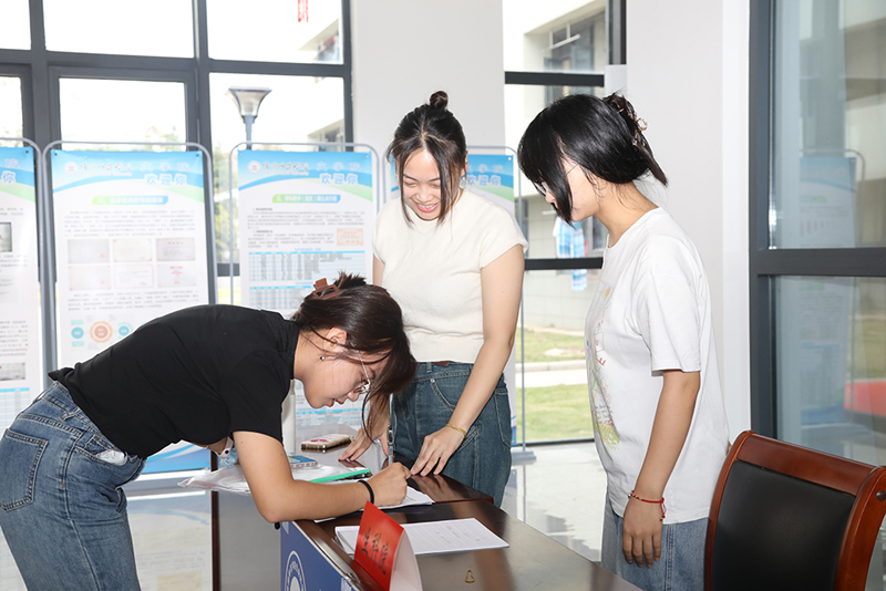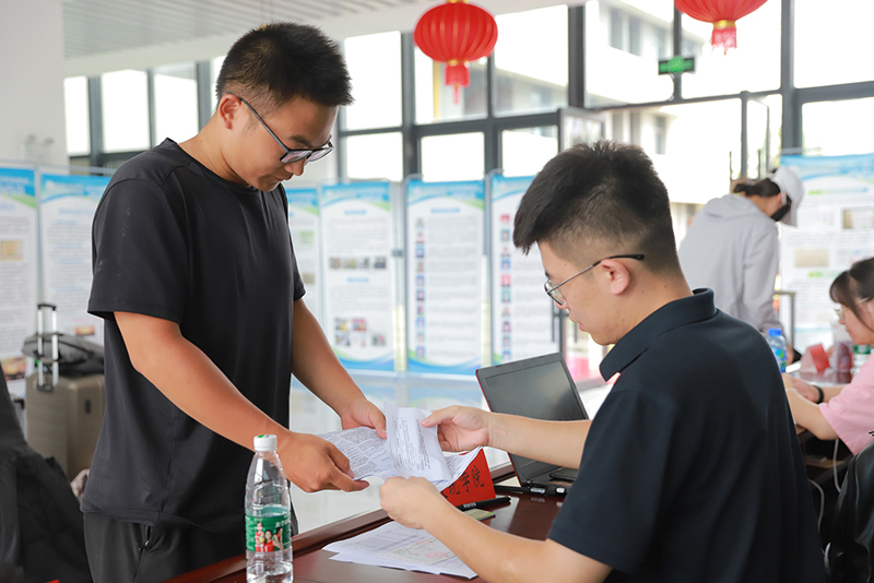 迎新现场,相关职能部门、二级学院热情服务,欢迎新同学们的到来。迎新展示板上有每一位新生的名字,他们来到展示板前签名“打卡”,和家长们合影留念,留下与淮师的第一张合影以及在淮师的第一个“印迹”。