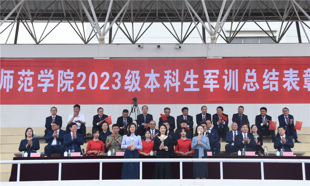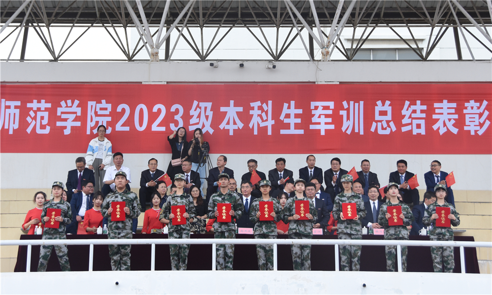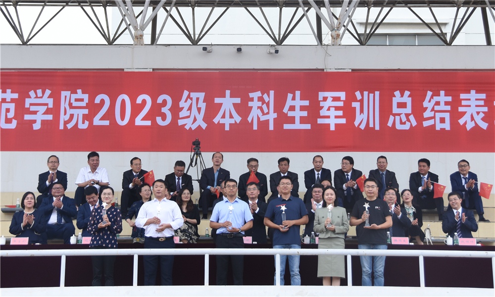 大会对军训汇演一、二、三等奖,对军训中表现突出的军事训练标兵、军训内务整理标兵、军训工作先进个人和优秀教官进行了表彰,在主席台前排就座的领导为获奖代表颁奖。