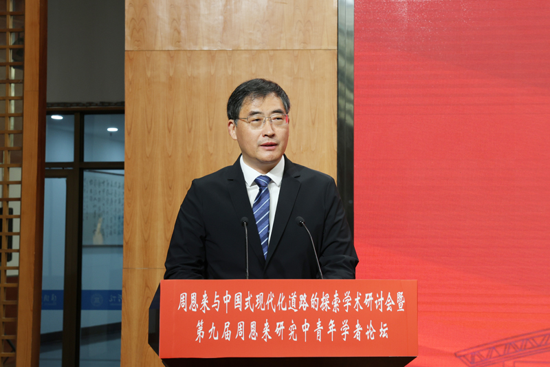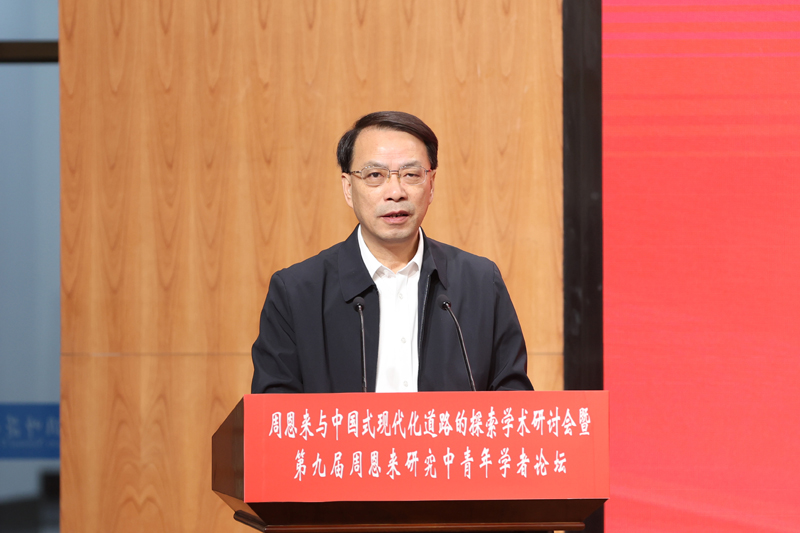 尚洪波致辞。他指出,周恩来是中国社会主义现代化建设的一位主要开拓者和奠基者,在推进中国现代化建设方面积累了丰富的理论和实践经验。系统研究周恩来与我国现代化事业发展的系列问题,有助于更加全面了解我们党探索中国式现代化的艰辛历程,深入理解新时代中国式现代化的理论与实践,对新征程上全面贯彻新发展理念,加快构建新发展格局,以中国式现代化全面推进中华民族伟大复兴,具有重要理论价值和现实意义。尚洪波介绍了学校近年来办学治校、周恩来思想生平研究以及用周恩来崇高精神风范办学育人等方面取得的成绩。他表示,淮师将以本次研讨会为契机,从中汲取营养和智慧,用历史映照现实、远观未来,紧紧围绕立德树人根本任务,做周恩来崇高精神风范的积极传承者和模范践行者,牢记嘱托、感恩奋进,培养拥有“四个自信”的时代新人。