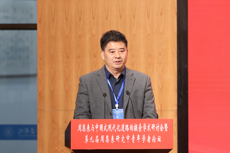胡金波在讲话中指出,周恩来是我们党探索中国式现代化的决策者、实践者、推动者,为中国式现代化作出了毕生贡献。本次研讨会暨中青年学者论坛,对于回顾周恩来对中国式现代化道路不懈探索的历程,探讨如何更加自觉地传承弘扬周恩来崇高精神风范,更加坚定地以中国式现代化全面推进中华民族伟大复兴具有重要意义。胡金波以“中华崛起与道路探索”为题,从“少年立志,倾情寻求中华崛起的现代化道路”“坚定不移,着力构筑新中国现代化制度根基”“求真务实,潜心描绘适合国情的现代化蓝图”“尊重自然,共产党人决不能成为历史的罪人”等四个方面作主题报告。胡金波强调,我们要深入分析周恩来对中国式现代化道路艰难而执着的探索与杰出贡献,加深对周恩来等老一辈革命家的研究,向历史寻经验、向历史求规律、向历史探未来,更加坚定地向着现代化目标迈进,迎来伟大复兴的光明前景。