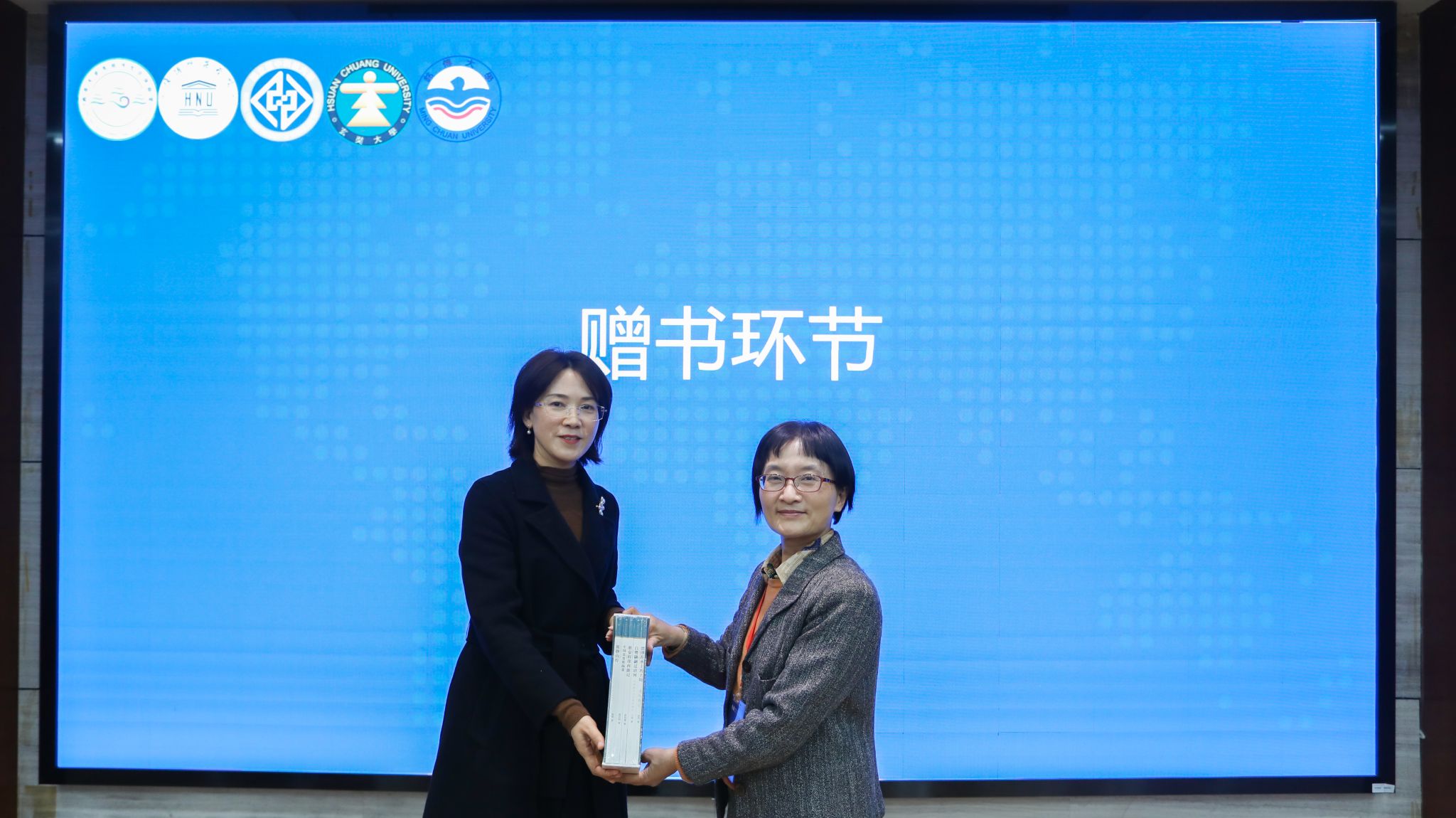 图为淮师港澳台事务办公室主任刘芳向玄奘大学赠书。记者 高俊晖 摄