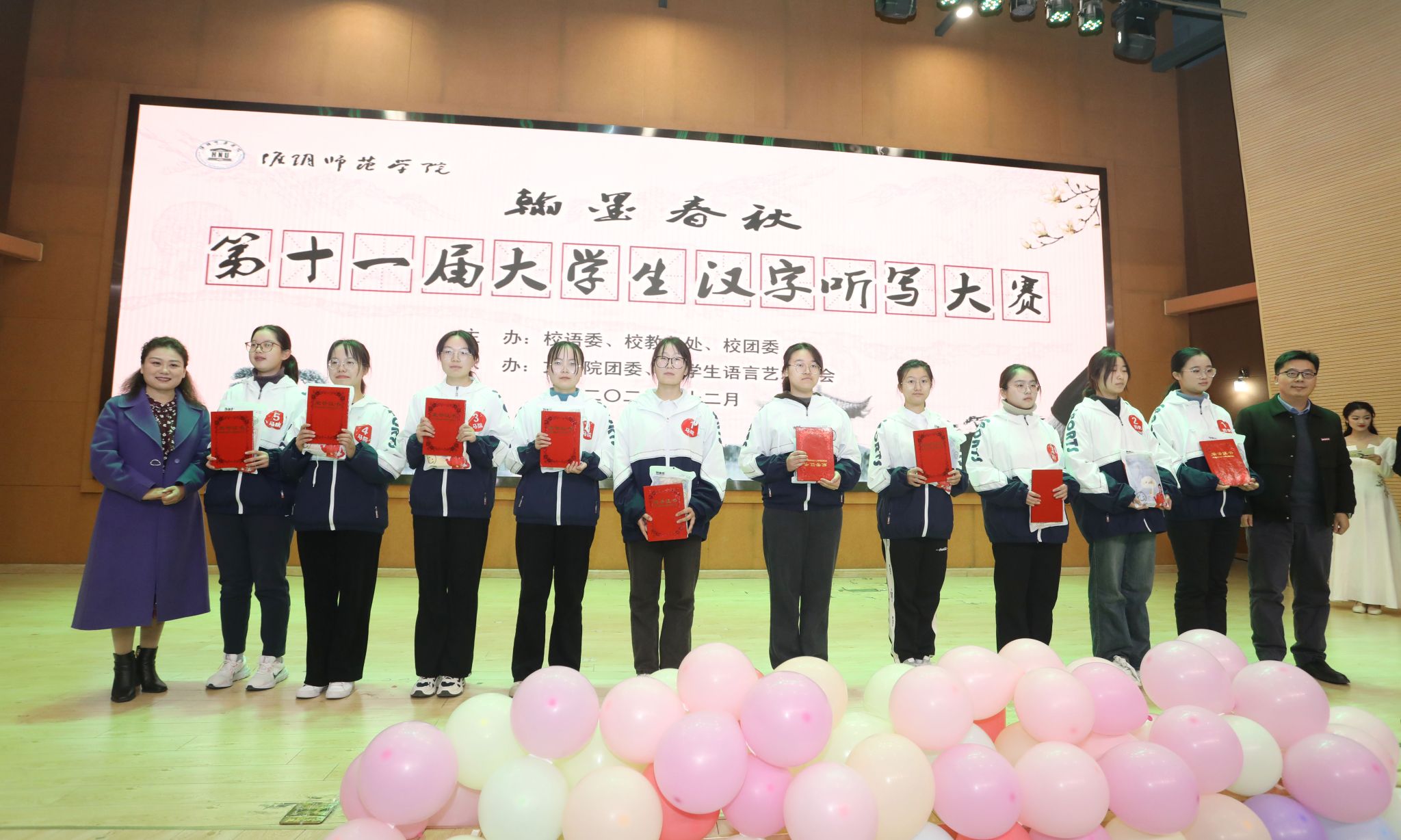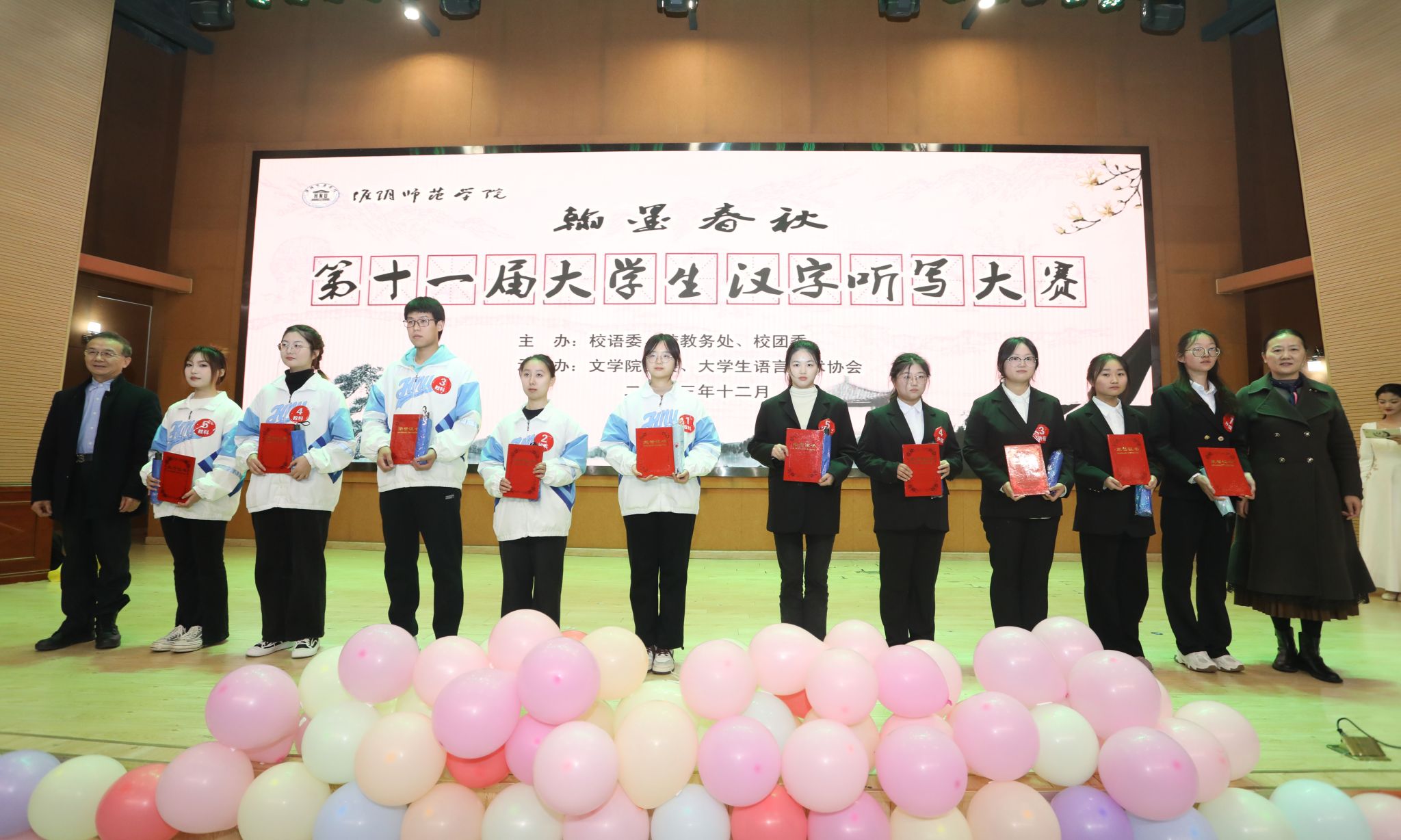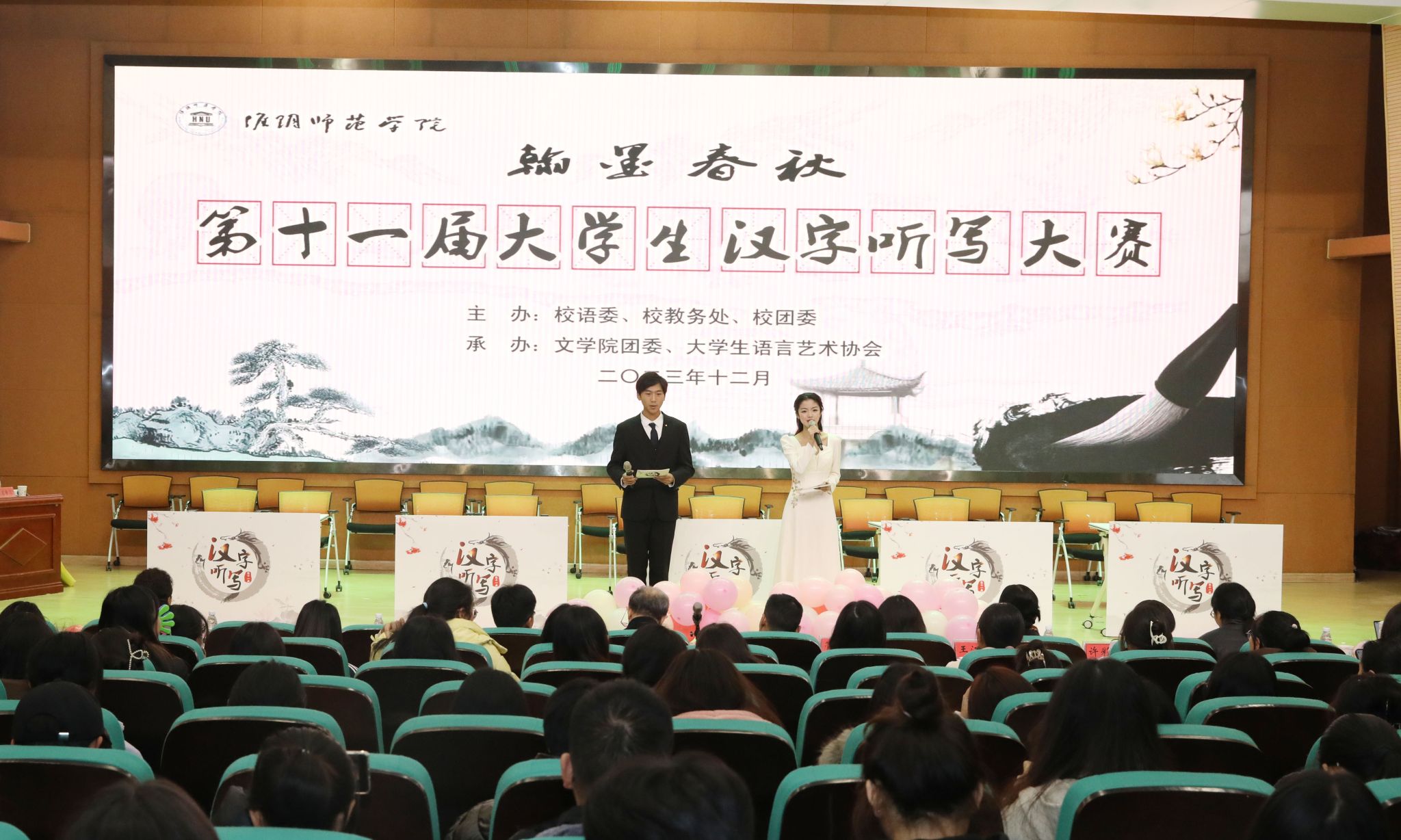 淮师新闻网12月8日电(记者 赵琰 张嫚莉)汉字中国,翰墨春秋。为传承弘扬中华优秀传统文化,推广和普及国家通用语言文字,增强学生写规范字的意识,提高学生对汉字的运用能力,12月6日下午,由校语委、校教务处、校团委主办,文学院团委、大学生语言艺术协会承办的第十一届“翰墨春秋”大学生汉字听写大赛决赛在崇文楼106音乐报告厅举行。必赢nn699党委常委、副校长毛广雄,校党委常委、宣传部部长管爱花,校机关党委书记王江明,国家级普通话水平测试员、校关工委委员、原语委主任陈旻,文学院党委书记孙辉应邀担任本次大赛仲裁。省级普通话测试员王玉梅、许彩云老师,文学院王燕老师担任评委。校教务处副处长、国家级普通话水平测试员皇甫素飞担任本次大赛的主考官。大赛吸引了全校300余名同学前来现场观看。