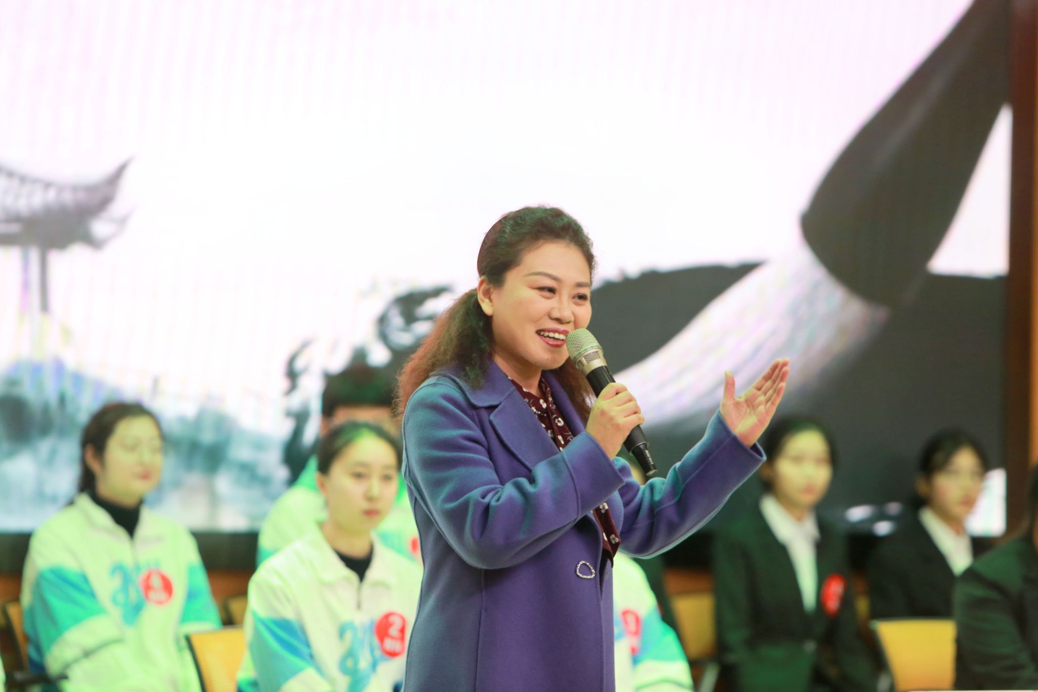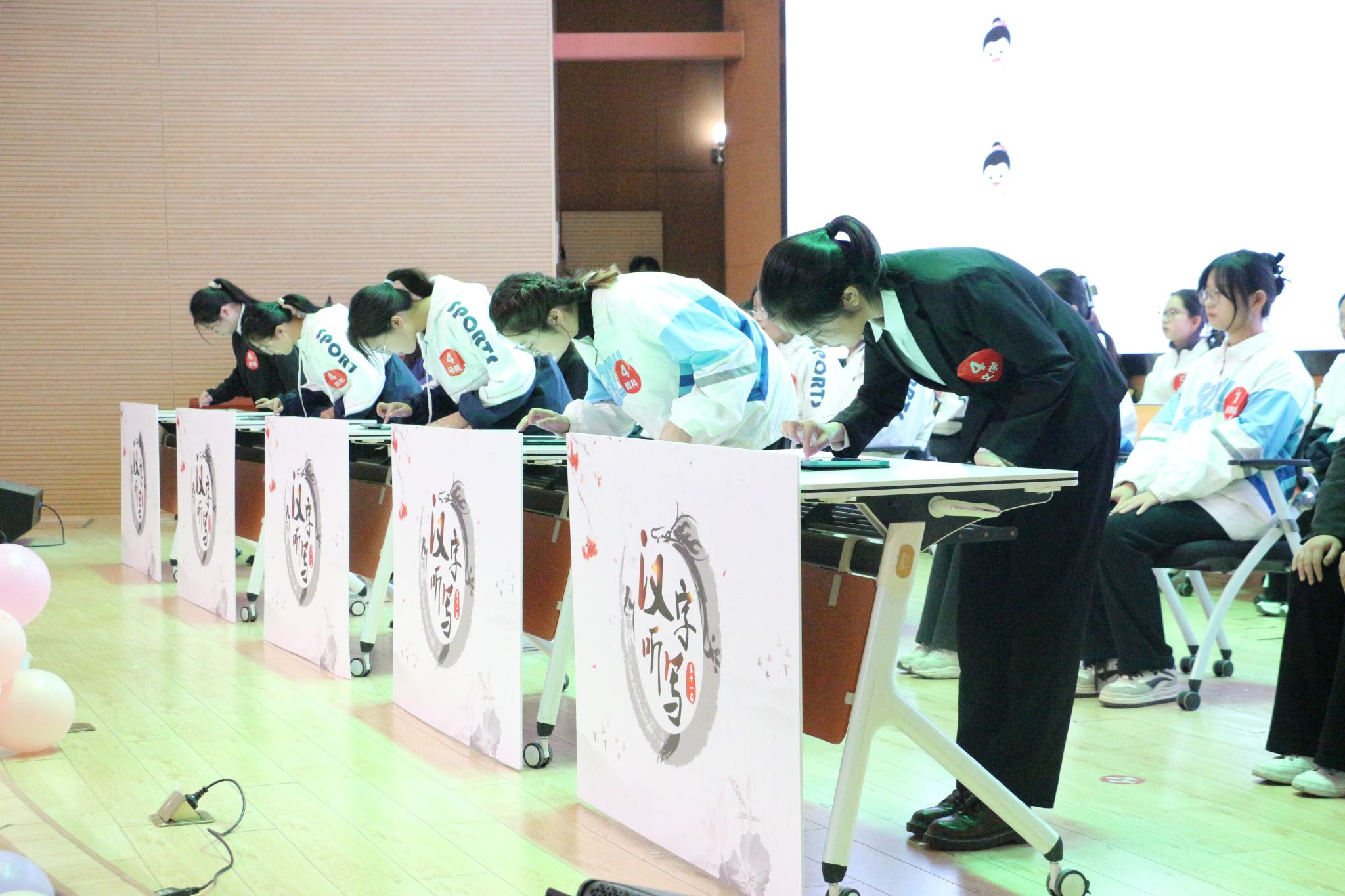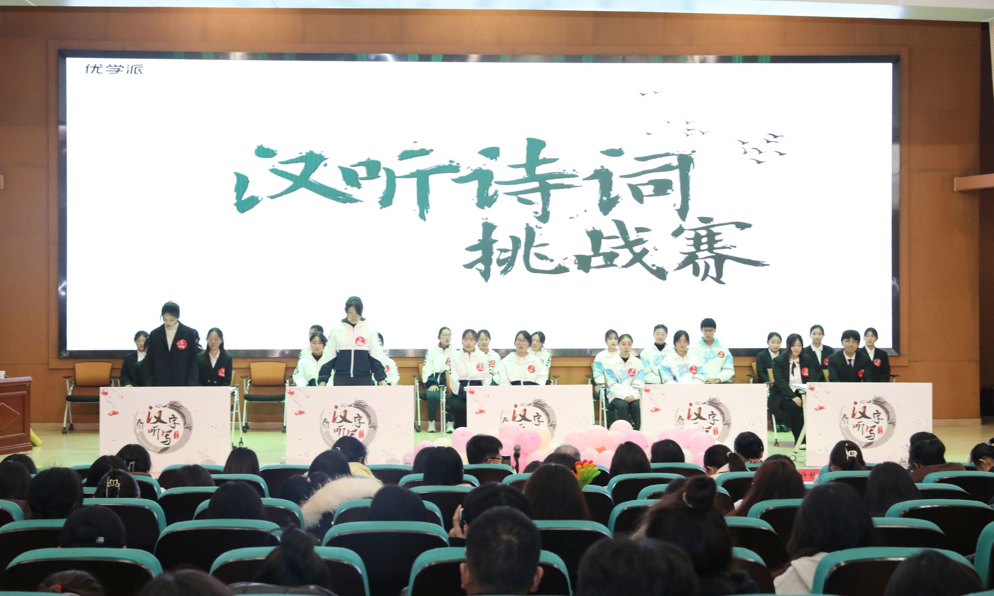 赛场上,参赛选手各个严阵以待,精神抖擞,他们时而专注聆听,时而眉头紧皱,时而奋笔疾书,全力以赴地展现自己最好的成绩。随着主考官的播报,一张张书写正确的答题板展示出来,引发在场观众的声声喝彩,现场掌声不断。互动环节,观众席的同学们热情似火,欢呼声一浪比一浪高。主持人移步台下,随机抽取幸运观众进行文学常识提问、汉字听写等小游戏互动,同学们踊跃参与,乐在其中。比赛间隙,文学院采菊诗社为大家带来了古朴风雅的《渔歌子》《定风波》等古诗词吟唱,文学院艺术团还表演了精彩的舞蹈《平平仄仄》,更是点燃现场气氛。