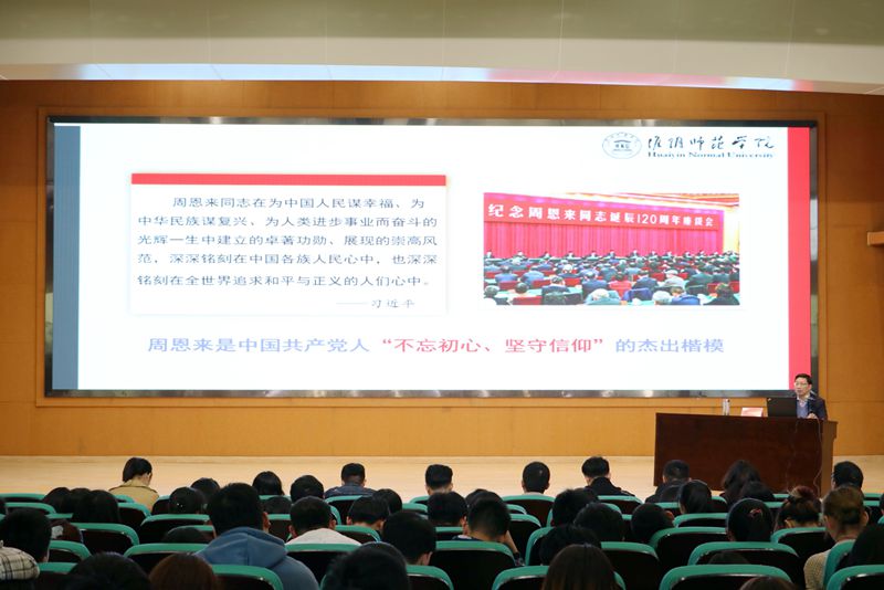 韩同友以《学习杰出楷模周恩来,坚守共产党人初心与使命》为题作专题报告。他从中国共产党人的初心与使命、周恩来是不忘初心、坚守信仰的杰出楷模两个方面出发,用生动的史实和事例,带领大家重温了周恩来总理的伟大人格和崇高精神,并对初心使命是什么,中国共产党人的初心与使命的产生,中国共产党人初心与使命的与时俱进以及周恩来初心与使命的确立、呈现、坚守等内容进行了充分而深刻的解读。他指出,周恩来精神是一本学不完的书,是一座在亿万人民心目中的丰碑,是一面对照自己的镜,是一座用之不竭的精神富矿,是激励新时代青年不断成长进步的不竭动力和精神宝藏。同时,韩同友还要求大家在平时的学习生活中能够以“学”字增强本领能力、以“行”字坚定理想信念、以“诚”字提升道德修养,以“新”字不断求新创新。