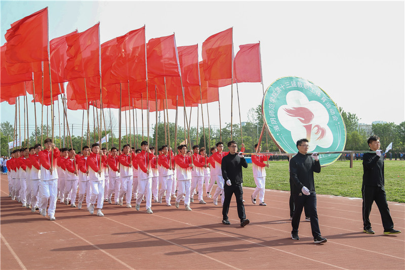 在雄壮有力、富有朝气的运动员进行曲中,校旗、会徽、彩旗方阵、裁判员方阵、运动员方阵,以及来自17个二级学院、继续教育学院、后勤服务集团、机关、图书馆、离退休的运动员方阵代表昂首阔步,斗志昂扬地走过主席台。