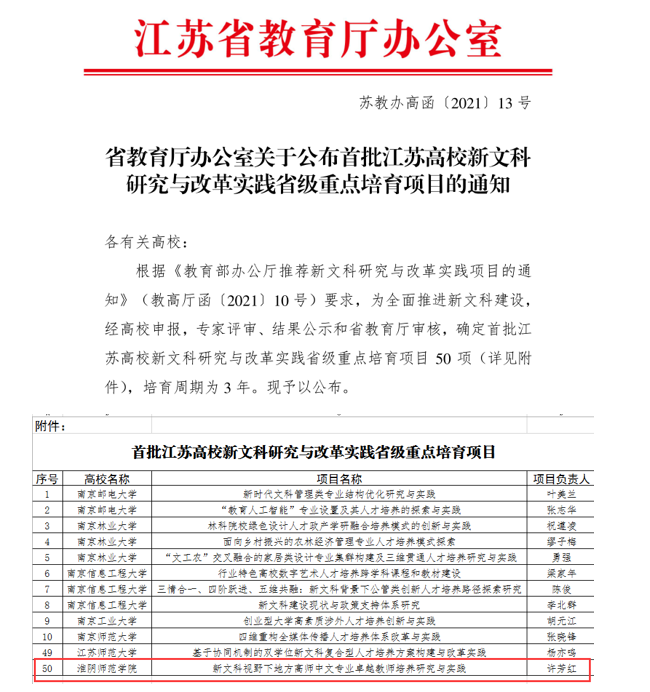 淮师新闻网5月13日电(记者 周洪波)5月10日,江苏省教育厅发布了《省教育厅办公室关于公布首批江苏高校新文科研究与改革实践省级重点培育项目的通知》(苏教办高函〔2021〕13号),必赢nn699文学院许芳红教授主持申报的《新文科视野下地方高师卓越教师培养研究与改革实践》项目获批立项。