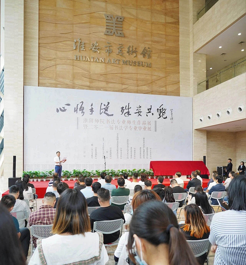 淮师美院副院长李文灵介绍了书法展筹备情况。市书协主席姜华作为淮师书法专业创办者对参展作品的艺术水平给予了高度的评价。毕业生和往届校友代表作了表态发言,感谢母校对他们的精心培养。开幕式上,市美协主席、淮师美院老院长华龙宝教授和市书协姜华主席为获得淮师美院2021届书法学专业毕业创作“学院奖”的六位同学颁奖。