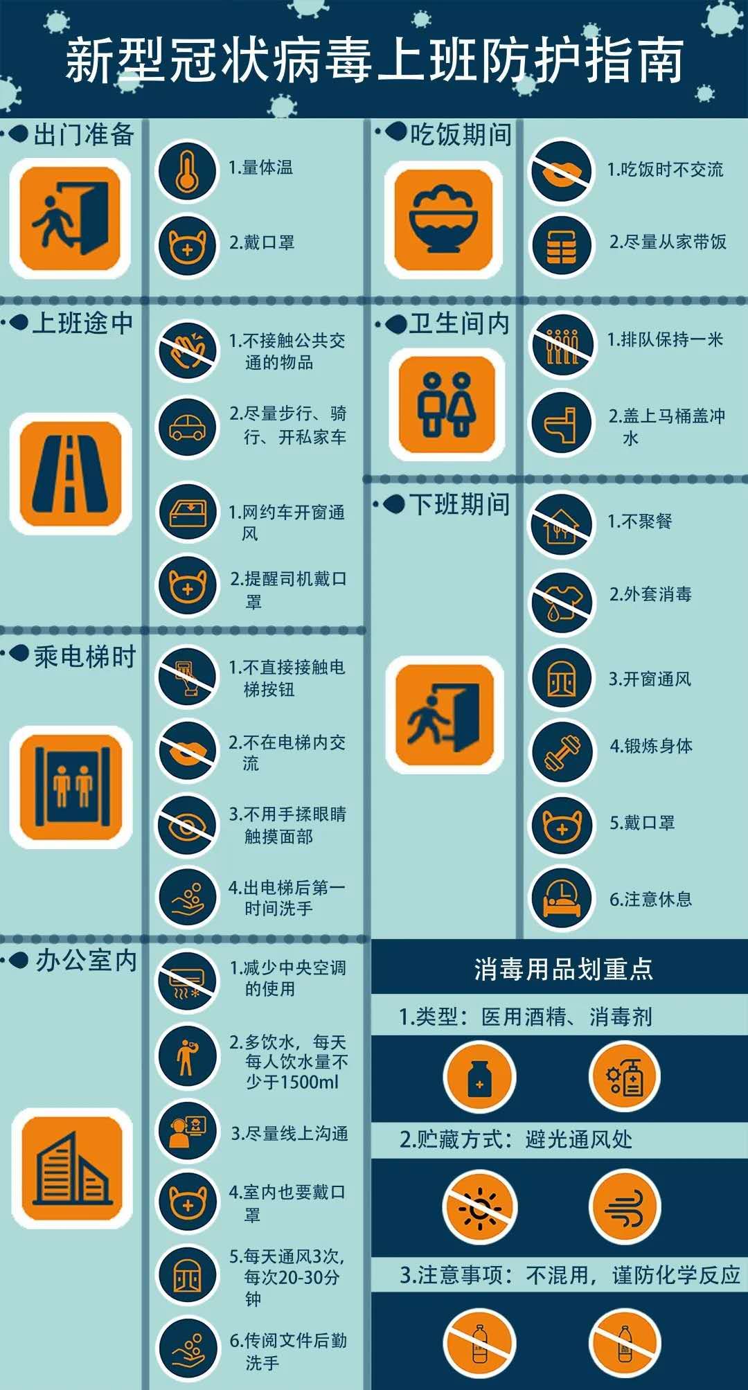 【设计说明】新冠状病毒肆意侵略人类的身体,日常生活的细节注意成了疫情蔓延的阻挡板。该设计以严谨的蓝色调为主,体现该信息图表的严谨认真,以上班族的生活流程为主线,用简单清晰明了的两种图标分别展现从上班出门到下班回家的生活流程中的预防新型冠状病毒的注意事项,为人们有效提供了科学防控措施。